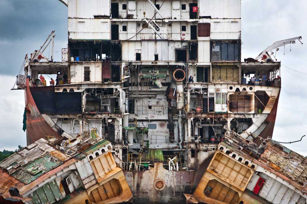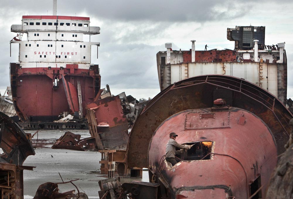 The Chittagong shipbreaking yard is the final resting place (ship graveyard) of large commercial vessels from all over the world. Old ships are purchased and then decommissioned by workers who salvage what they can before reducing these great monsters into piles of scrap metal.
